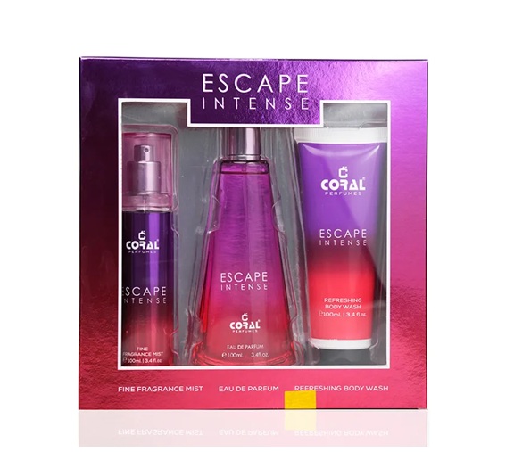 Introducing the Coral Escape Intense Set, featuring a luxurious combination of Coral Escape Intense EDP 100ml, Fragrance Mist 100ml, and Bodywash 100ml.