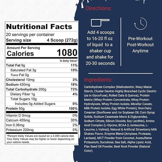- 1230 High quality calories and 50 Gram of protein^Features seven amino acid packed protein sources^No sugars added^Gluten and artificial color free^Contains patented GanedenBC30 probiotic to support digestive and immune health