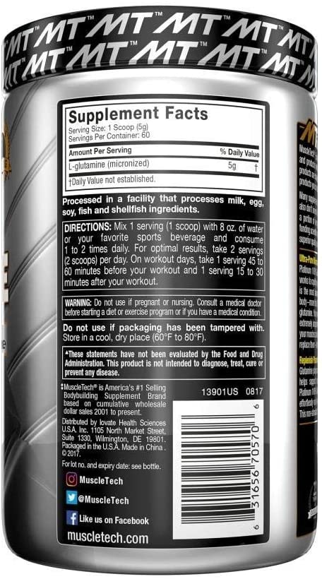 Platinum 100% Glutamine supplies 5g of glutamine per serving, which works to rapidly replenish the glutamine used during training. Glutamine is the most abundant non-essential free amino acid in your body – more than 20% of the total circulating amino acids in your body are glutamine. Your muscles are especially high in glutamine, making it extremely important for muscle metabolism.