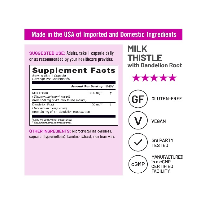 NatureWise Milk Thistle Capsules are here to support your liver function and help maintain daily liver health.* Specially formulated for men and women, this powerful liver supplement is designed to help your body cleanse and convert nutrients for daily wellness.*Each vegan capsule delivers the equivalent of 1,000 mg of milk thistle derived from a potent 4:1 extract, ensuring maximum support.* Complementing this is the equivalent of 100 mg of dandelion root extract, also standardized to a 4:1 potency, for added antioxidant benefits.* Together, these herbal ingredients provide a comprehensive solution for those looking to maintain or support liver health.*Milk thistle and dandelion root are renowned for their antioxidant properties. These natural botanicals work synergistically to support the liver's daily functions and health.*NatureWise Milk Thistle capsules are formulated with care, and free from artificial colors, flavors, and GMOs. These milk thistle capsules are vegan, and do not contain wheat, gluten, dairy, eggs, soy, tree nuts, peanuts, fish, shellfish, or sesame. This makes them suitable for a wide range of dietary preferences and sensitivities. *Statements regarding dietary supplements have not been evaluated by the FDA and are not intended to diagnose, treat, cure, or prevent any disease or health condition.![NatureWise Milk Thistle + Dandelion Root - Vegan, Non-GMO, - 60 Capsules[60-Day Supply]](https://i5.walmartimages.com/asr/c49e03e2-5a17-4210-b861-49b8a8ca8087.d35411c3e81f0c3f0aed80611f11aaa4.jpeg?odnHeight=2000&odnWidth=2000&odnBg=FFFFFF)