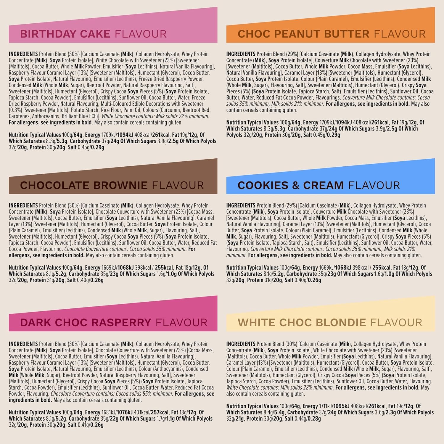 Flavor | Cookies & Cream, Chocolate brownie, Dark Choc Matcha, Dark Choc Raspberry, Dark Choc Red Velvet, White Choc Blondie |