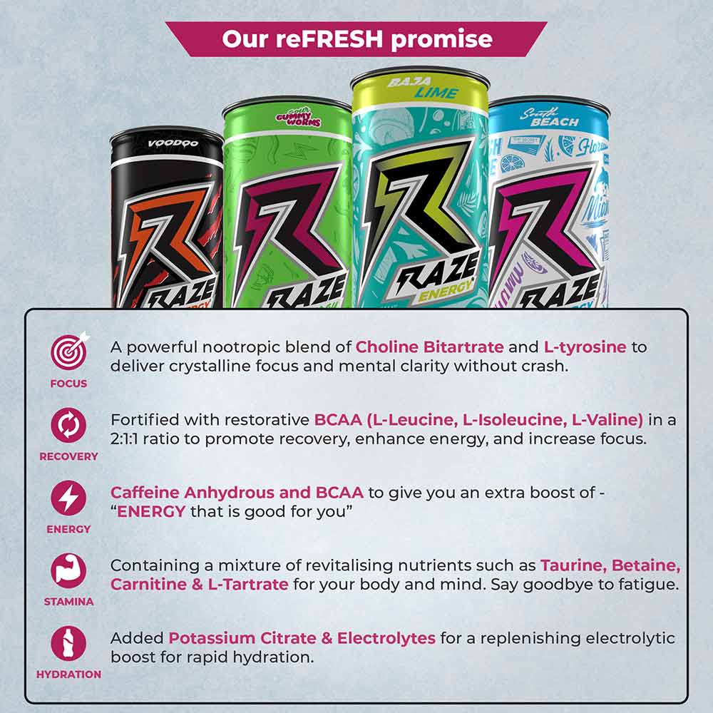 Raze Energy takes a giant leap of faith with instilling a high quality formula to bring the consumer a powerful yet sustained, energetic experience to help push your workouts and focus in general to the very next level. Perfect for anyone at anytime, Raze Energy has become the most popular and best rated energy drink on the market to date with a phenomenal flavor profile that puts most competitors to shame. Powered by the enhanced REFRESH technology, Raze Energy delivers with a performance enhancing energy drink profile that aids in the most often overlooked categories. We wanted to develop and energy drink that aids in multiple different categories which includes; Targeted focus, enhanced recovery time as glycogen becomes depleted, improved clean energy levels, boost in stamina and hydration. Most importantly, each can of Raze Energy has absolutely zero calories, zero sugar and zero carbohydrates to give you a smarter and healthier option. You shouldn t have to settle for an energy drink that contains more sugar and carbohydrates than you can count. Instead, opt for the smart choice with the 1 fan voted energy drink on the market to date with Raze Energy. Not only is our RE(FRESH) technology a complete game changer but the wide variety of flavor options and crowd sourced additions to the Raze family make up one of the highest quality energy drink choices you could ever choose from. With certain flavors being more simplistic all the way to industry first s there is never a bad option when looking for the perfect flavor.