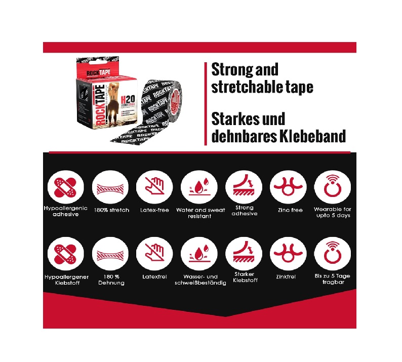 - STRONG ADHESIVE AND BIG STRECTH : RockTape's secret is in our high-grade adhesives and unique fabrics. Unlike other kinesiology tapes, RockTape is designed to stay on longer, move and flex with your skin, and repel moisture.